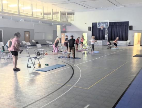 - This class includes exercises with weights, bands with movement in and out of a chair, and yoga stretching at the end.